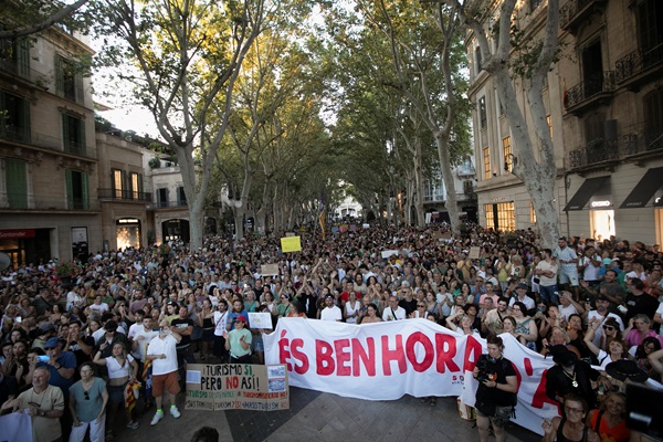 People take part in a protest against mass tourism in Palma de Mallorca, Spain, 21 July 2024; the banner reads "It's time to stop";