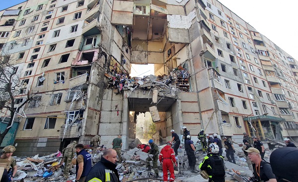 Firefighters and rescuers work at the site of an apartment building hit by a Russian air strike, amid Russia's attack on Ukraine in Kharkiv, 24 September 2024;
