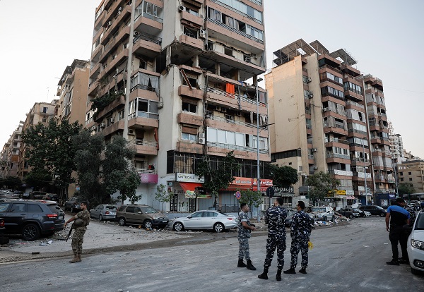 Police officers work at the site of an Israeli strike, amid ongoing cross-border hostilities between Hezbollah and Israeli forces, in Kola, central Beirut, Lebanon, 30 September 2024;