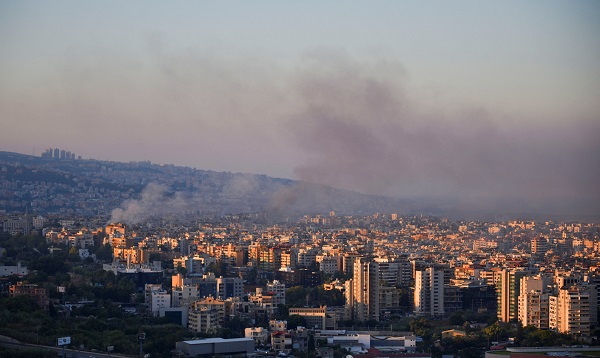 Smoke billows over the southern suburbs of Beirut and its surroundings, amid the ongoing hostilities between Hezbollah and Israeli forces, as seen from Sin El Fil, Lebanon, 4 October 2024;