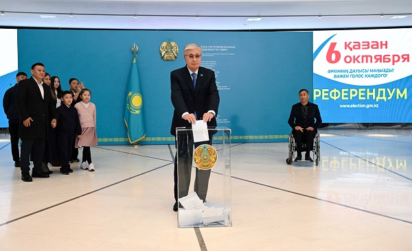 Kazakh President Kassym-Jomart Tokayev casts his vote during a referendum on the construction of a nuclear power plant, at a polling station in Astana, Kazakhstan, 6 October 2024;