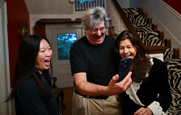 Gary Ruvkun, 2024 Nobel Prize in Physiology or Medicine winner, his wife and daughter speak with fellow Nobel Prize winner Victor Ambros, via phone at his home in Newton, Massachusetts, US, 7 October 2024;