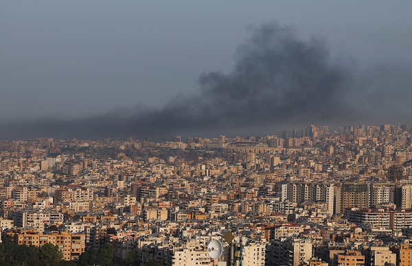 Smoke billows over Beirut's southern suburbs after an Israeli strike, amid the ongoing hostilities between Hezbollah and Israeli forces, as seen from Hadath, Lebanon, 16 October 2024;