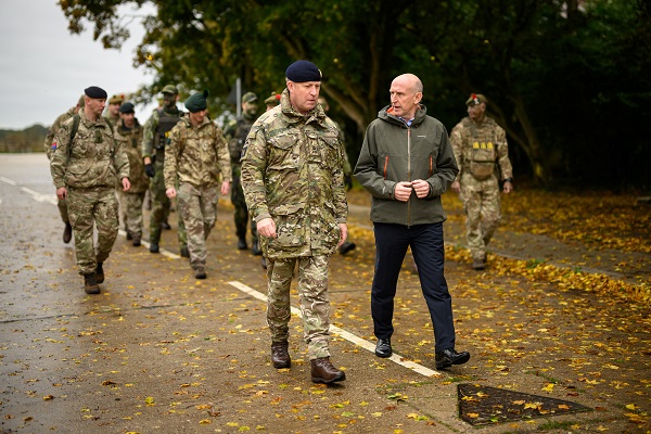 British Defence Secretary John Healey speaks with soldiers and staff at the Stanford Training Area, near Thetford, UK, 20 October 2024;