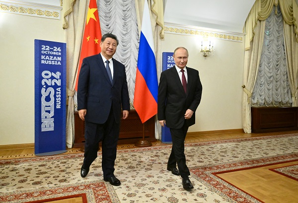 Russian President Vladimir Putin and Chinese President Xi Jinping walk during a meeting on the sidelines of the BRICS Summit in Kazan, Russia, 22 October 2024;
