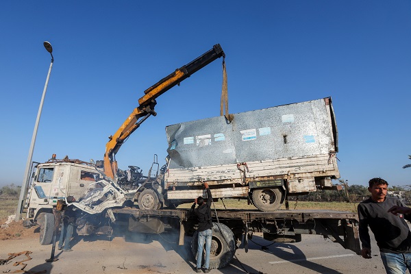 Palestinians work to remove an UNRWA-labelled vehicle after it was hit in an Israeli strike, according to Palestinian officials, amid the Israel-Hamas conflict, in Deir Al-Balah in the central Gaza Strip, 23 October 2024;