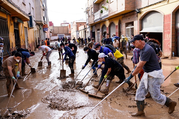 People clean a muddy street in the aftermath of the flooding caused by heavy rains in Massanassa, Valencia, Spain, 8 November 2024;
