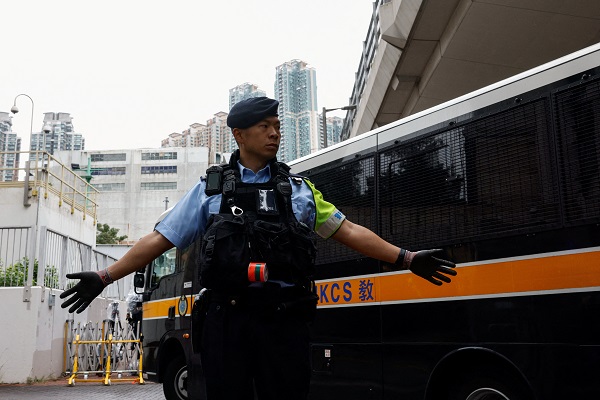 A police officer stands guard as a prison van arrives at the West Kowloon Magistrates' Courts building, ahead of the sentencing of 45 convicted pro-democracy activists charged under the national security law, in Hong Kong, China, 19 November 2024;