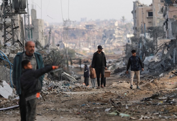 Palestinians walk next to damaged buildings after Israeli forces withdrew from a part of Nuseirat, following a ground operation amid the ongoing conflict between Israel and Hamas, in Nuseirat, central Gaza Strip, 29 November 2024;