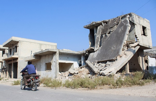 A man rides a motorbike past a damaged building in Homs, Syria, 7 November 2024;