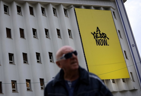 A man walks past a banner that was made for the one-year anniversary of the deadly 7 October 2023 attack by Hamas, in Tel Aviv, Israel, 11 December 2024;