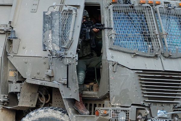 An Israeli soldier holds a weapon in a military vehicle, during an Israeli raid in Tulkarm, in the Israeli-occupied West Bank, on 31 October 2024.;