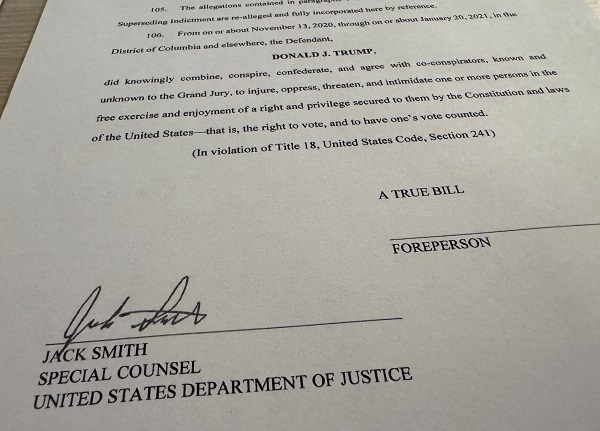 Special Counsel Jack Smith's signature is seen on a revised indictment in the 2020 election subversion case against Donald Trump after US prosecutors obtained the indictment in Washington, US, 27 August 2024;