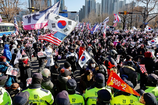 Impeached South Korean President Yoon Suk Yeol's supporters rally near the Corruption Investigation Office for High-ranking Officials, following his arrest, in Gwacheon, South Korea, 15 January 2025;