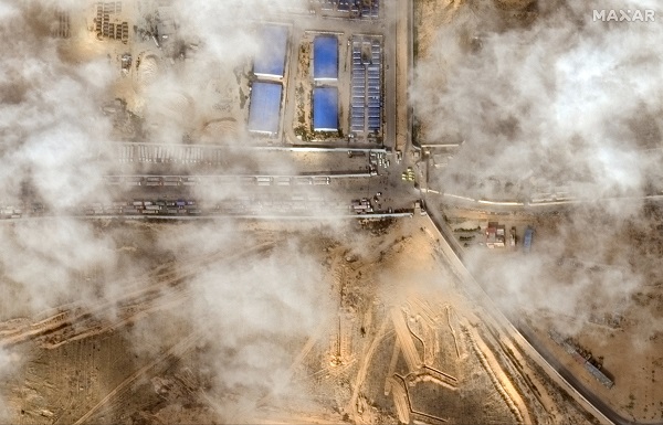 A satellite image shows aid trucks waiting at the Rafah-Egypt border, 20 January 2025;