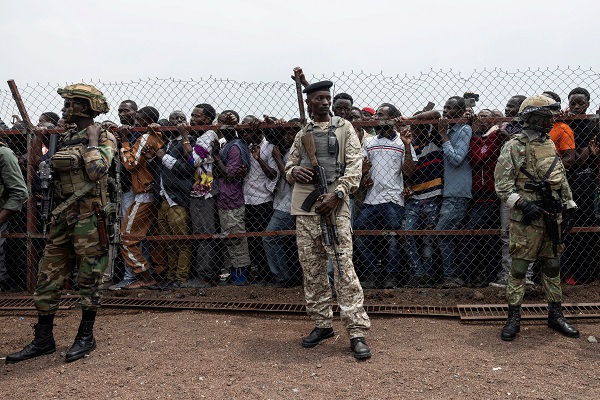 M23 rebels stand guard near civilians during a meeting organised by the M23 at the Stade de l'Unité, after the town of Goma was taken by the M23 rebels, in Goma, Democratic Republic of Congo, 6 February 2025;