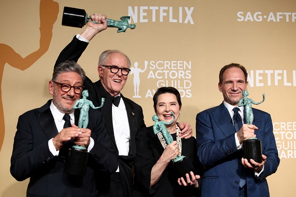 The Conclave cast of Ralph Fiennes, Stanley Tucci, John Lithgow and Isabella Rossellini won best movie ensemble at the SAG Awards, a red-carpet ceremony that streamed live on Netflix. The film tells the story of the secret maneuvering at the Vatican during the selection of a fictional pope.