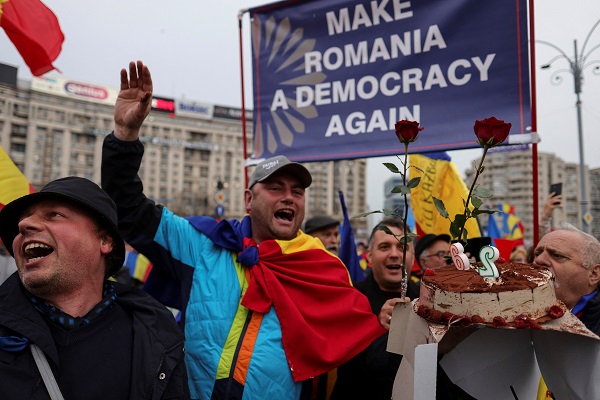BUCHAREST (Reuters) - Thousands of Romanians gathered in the capital Bucharest on Wednesday 26 March 2025 to protest the December cancellation of a presidential election and the banning of its far-right frontrunner from standing for office again.