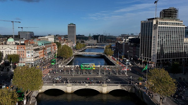 A drone view shows traffic on O'Connell bridge on the river Liffey with the Customs House and Liberty Hall visible, in the city centre of Dublin, Ireland, 7 October 2024;