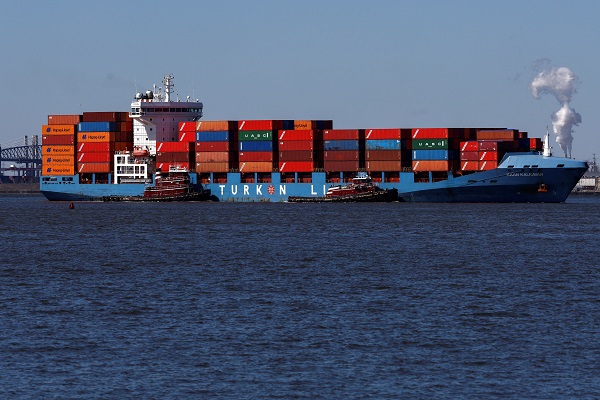 A cargo ship is brought into the Port of Elizabeth marine terminal seen from Bayonne, New Jersey, US, 9 April 2025;