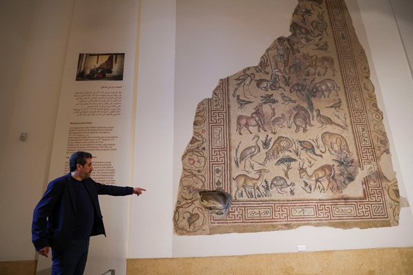 Sarkis Khoury, Lebanon's Director General of Antiquities, points at a mosaic artefact that was damaged during the Lebanese civil war, at the National Museum of Beirut, in Lebanon on 10 April 2025.;