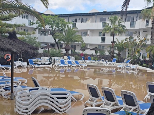 A view shows the flooded El Trebol apartment complex, in Costa Teguise, on the island of Lanzarote, Spain, on 12 April 2025;