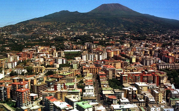 A view of Mount Versuvius looming over the southern Italian city of Naples.;
