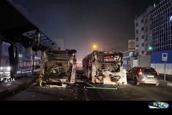 Burnt vehicles lie on the road following unrest sparked by dire economic conditions, in a place given as Tehran, Iran, Saturday 10 January 2026, in this screengrab from Iran's state media broadcast footage.;