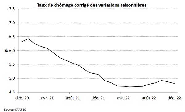 The number of resident job seekers receiving full unemployment benefit fell by 55 people or 0.7% over one year, to 7,674. The number of beneficiaries of other measures stood at 4,008 and is below the level observed in December 2021 (-217 people, or 5.1%).