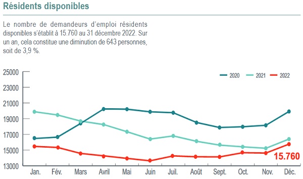 The number of available resident jobseekers registered with ADEM amounted to 15,760 as of 31 December 2022, down by 643 people (i.e. -3.9%) compared to December 2021. The number of people seeking employment is overall in decline for those registered for 12+ months with ADEM. Comparing the number of job seekers in November 2022, however, there is an increase of 1,138 people (i.e. +7.8%). This increase mainly concerns people over 45 years of age.