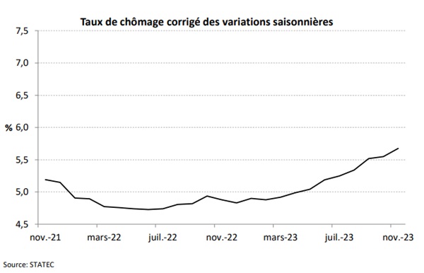 The number of resident job seekers benefiting from full unemployment benefit increased by 2,138 people or 29.2% over one year, to stand at 9,463. The number of beneficiaries of other measures stands at 4,212 and a slight decline compared to November 2022.