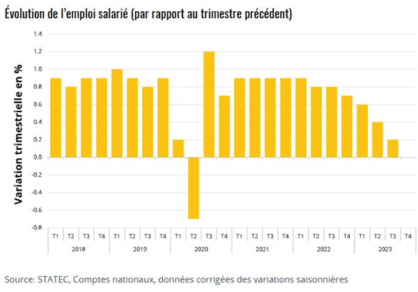 Financial and insurance activities (+3.2% over one year), as well as administration and other public services (+3.3% over one year), are the most dynamic branches in annual comparison. For financial and insurance activities, favourable development comes from the activities of banking establishments. As for the second sector, it is the central administration services which recorded the most significant growth. In annual variation, the construction sector experienced a significant drop of -1.4% in the number of employees. Residential and non-residential building construction activities recorded the greatest job loss. This sector experienced three consecutive negative quarterly variations in 2023.