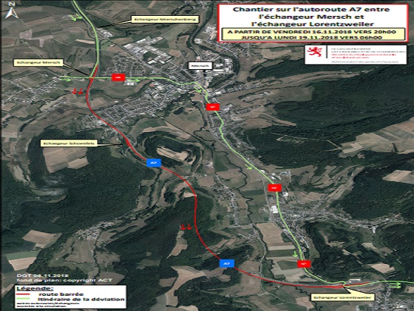 The following closures will be put in place during this period: the A7 motorway between the Mersch interchange and the Lorentzweiler interchange from Friedhof and towards the Grünewald junction and the Mersch interchange ramp from the N8 towards the Grünewald junction.