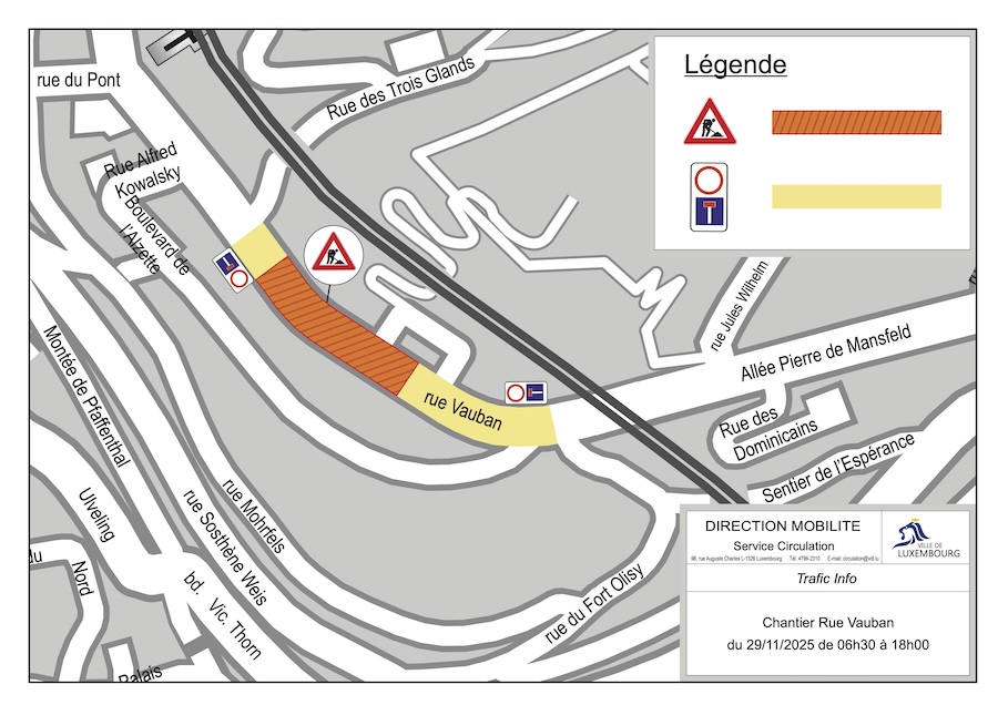 The City of Luxembourg (VdL) has announced that, as part of lifting works on Rue Vauban in Luxembourg-Pfaffenthal, traffic will be redirected on Saturday 29 November between the hours of 06:30 and 18:00.