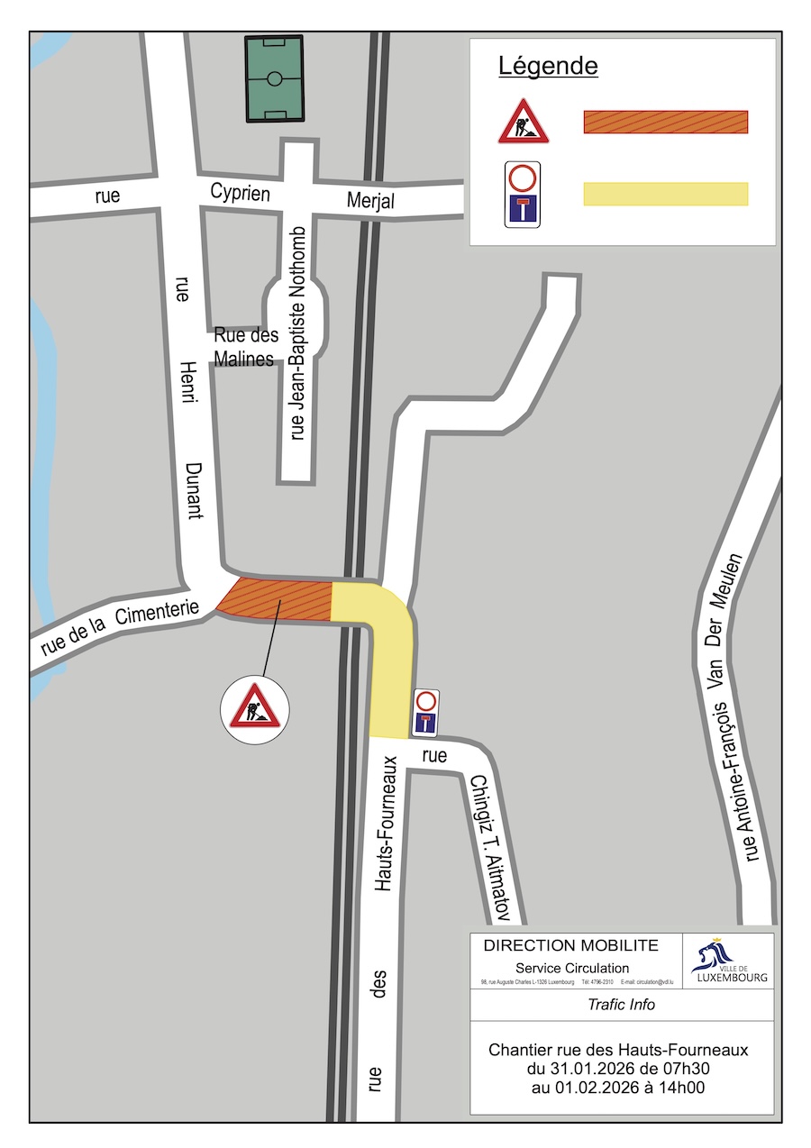 On Wednesday 28 January 2026, the City of Luxembourg (Ville de Luxembourg - VdL) announced that Rue des Hauts-Fournaux will be closed due to tree removal works which will take place from Saturday 31 January (07.30) until Sunday 1 February (14:00).