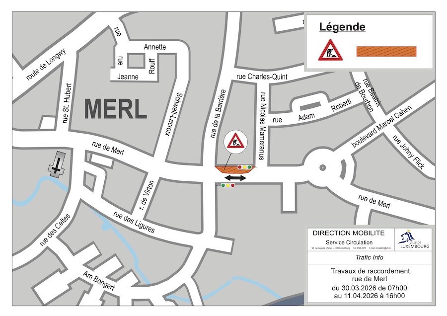 On Thursday 26 March 2026, the City of Luxembourg (VdL) announced that infrastructure works will take place on Rue de Merl in Luxembourg-Merl from Monday 30 March 2026 to Saturday 11 April 2026, between the hours of 07:00 and 16:00.