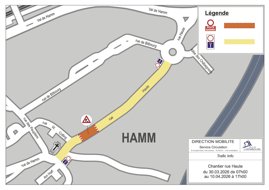On Thursday 26 March 2026, the City of Luxembourg (VdL) announced that infrastructure works will take place on Rue Haute in Luxembourg-Hamm from 07:00 on Monday 30 March to 17:00 on Friday 10 April.