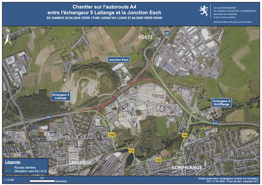 On Wednesday 22 April 2026, Luxembourg’s Roads and Bridges Administration announced that from Saturday 25 until Monday 27 April 2026 the A4 motorway between the Lallange interchange and the Esch junction in the direction of Luxembourg will be closed.