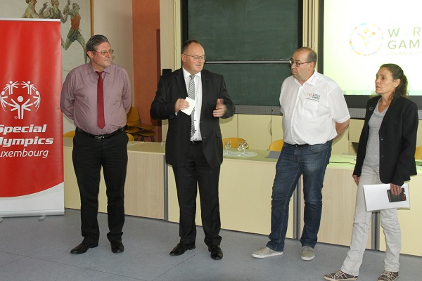 SOL Chairwoman Pascale Schmoetten conveyed much thanks to the Ministry of Sports, for their part in enabling real inclusion in sports for persons with intellectual disabilities. The head of delegation Marc Feltgen gave a short overview of the stay of the team in the States, as well the whole professional preparation the year before leaving for the games in LA; many medals and personal bests were the results of these efforts. Photographs shown on a large screen refreshed the great memories of the World Games in LA for those attending.