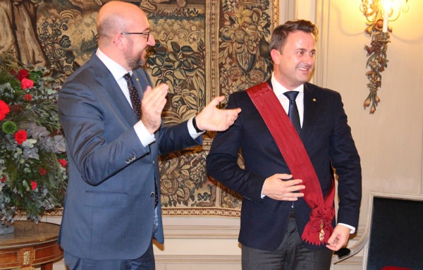 L-R: Belgium PM Charles Michel honours Luxembourg PM Xavier Bettel with Grand Cross of the Order of the Crown;