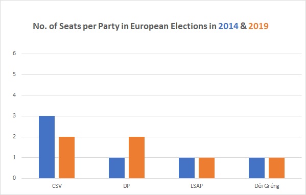 As a reminder, in 2014, the CSV secured three seats in the European Parliament, whilst the DP, the LSAP and the Greens filled the remaining three seats (one each). The elected Luxembourg MEPs for 2014-2019 were Viviane Reding (CSV) with 126,888 votes - replaced by Christophe Hansen in 2018 -, Charles Goerens (DP) with 82,975 votes, Claude Turmes (Déi Gréng) with 69,797 votes - replaced by Tilly Metz in 2018 -, Georges Bach (CSV) with 68,242 votes, Frank Engel (CSV) with 65,884 votes and Mady Delvaux-Stehres (LSAP) with 33,323 votes.