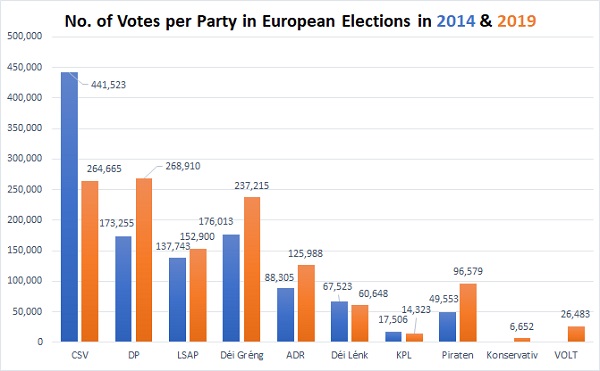 The Greens (237,215, +3.9%), the LSAP (152,900, +0.44%), the ADR (125,988, +2.51%) and the Pirate Party (96,579, +3.47%) each gained some votes in comparison to the previous European elections, whilst the Left (60,648, -0.93%) and the Communist Party (14,323, -0.35%) lost votes. The new parties Volt and the Conservatives received 26,483 and 6,652 votes respectively.