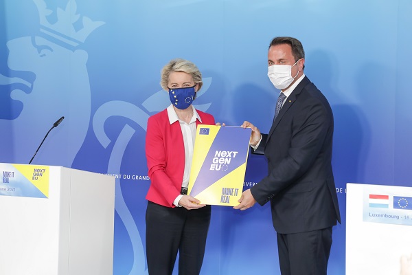 During her Luxembourg visit, which formed part of her tour to assess national recovery plans, the Commission President met with Prime Minister Xavier Bettel and Minister of Finance Pierre Gramegna at the headquarters of Luxembourg satellite company SES in Betzdorf, where she officially announced the Commission's favourable opinion.
