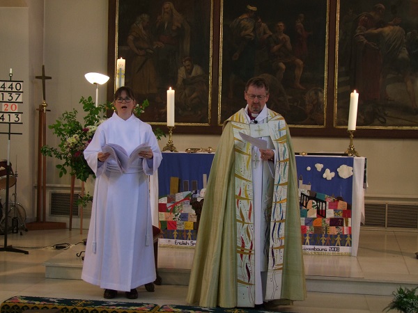 The service was led by the Right Reverend Dr Robert Innes, the Bishop of Gibraltar in Europe, who was assisted by the Archdeacon of North-West Europe, the Venerable Paul Vrolijk. Also attending were Leo Wagener, the Vicar-General of the Catholic Archdiocese of Luxembourg, Abbé Jean Ehret, Director of the Luxembourg School of Religion and Society, Panagiotis Moschonas, Episcopal Vicar of the Orthodox Church in Luxembourg, the Venerable Annette Cooper, Archdeacon of Colchester, and Theo Péporté, President of the Council of Churches.