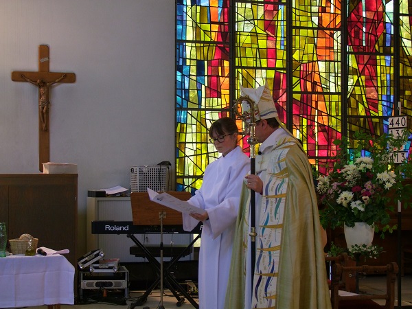 The service took the form of a Eucharist, with Bishop Robert Innes preaching. It also saw the two churchwardens, Simon Norcross and Philippa Seymour, participate in the service, as did a number of members of the congregation of the Anglican Church who presented offerings water for baptism, oil for healing, a bible, a lighted candle, bread and wine, a symbol of music, a symbol of ministry with young people, a symbol for the local community and a symbol of ecumenism.