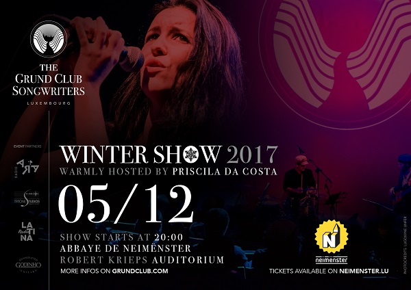 The Grund Club Luxembourg asbl has announced that the Grund Club Songwriters' Show Winter Edition will take place on Tuesday 5 December 2017 @ 20:00 in the Robert Krieps auditorium in the Abbay de Neumünster, Luxembourg-Grund.