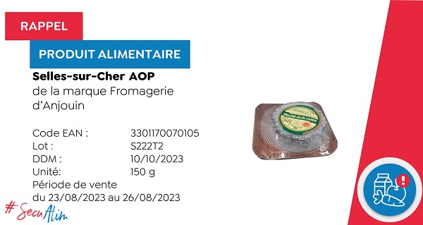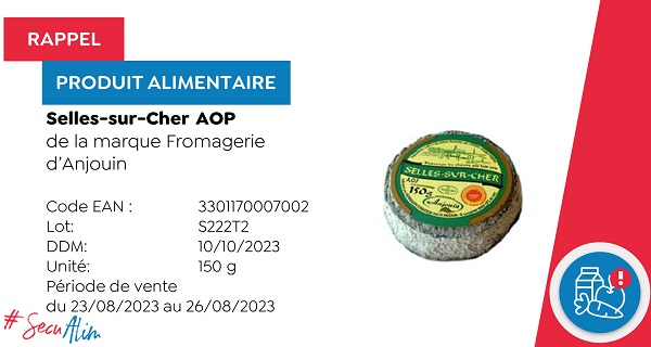 - Two types of Selles-sur-Cher AOP cheese (150 g) from the brand Fromagerie d'Anjouin, with the expiry date 10/10/2023 (for both) and respective barcodes 3301170007002 and 3301170070105. These products were sold at Auchan between 23 and 26 August 2023.