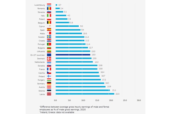 Luxembourg, leading the pack in gender pay equality, has recorded the lowest difference of 0.7% between average gross hourly earnings of male and female employees as percentage of male gross earnings in 2020.