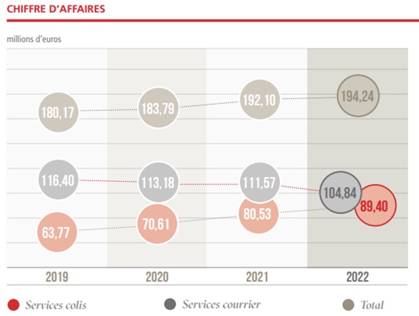 Parcel services total 16.55 million units, up 7.8% compared to 2021. The growth of the parcel services market is mainly supported by the inbound cross-border services market which recorded an increase of 7.6% and with a volume of 13.24 million packages. This trend, linked to the development of “B2C” electronic commerce, is based on a compound annual growth rate of 15.9% over the period 2019/2022.