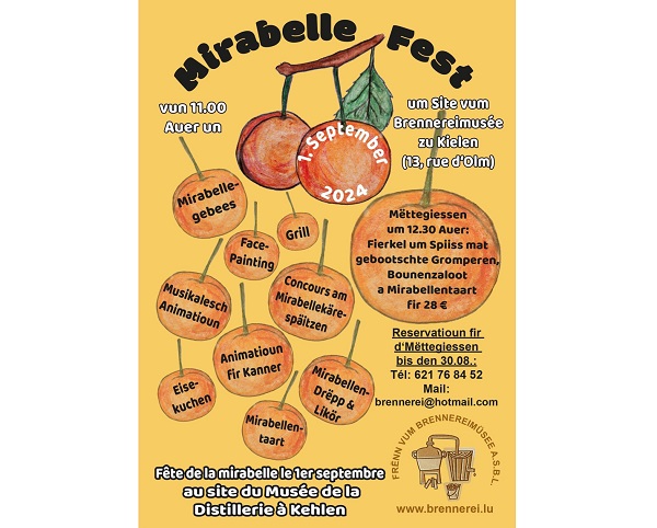 The Frënn vum Kielener Brennereimusée Asbl is organising the second edition of the "Mirabelle Fest" on the site of the Distillery Museum in Kehlen (13 Rue d'Olm) on Sunday 1 September 2024, starting at 11:00.